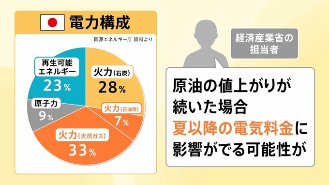 経済産業省の担当者は、「原油の値上がりが続いた場合、夏以降の電気料金に影響がでる可能性がある」と話していました。