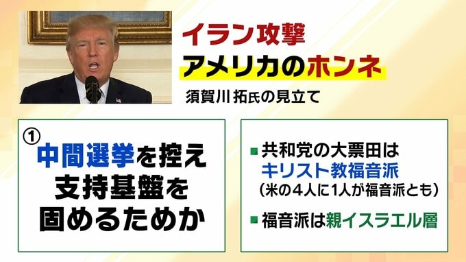 共和党の大票田である「キリスト教福音派」(アメリカの4人に1人が福音派)は親イスラエル層。その支持を繋ぎとめるために、イスラエルに寄り添う姿勢を鮮明にする必要がある、というのが須賀川氏の見立てです。