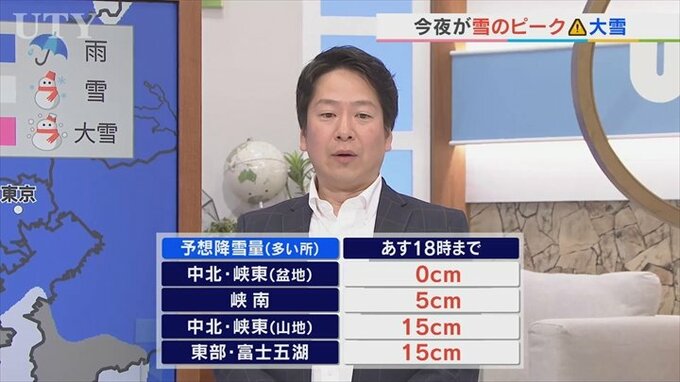 峡南5cm、中北、峡東の山地で15cm、東部・富士五湖で15cmとなっています。今回の雪は湿った重たい雪ですので、電線に乗るとその重みで架線が切れてしまう恐れがあります。ですから停電の恐れがありますのでくれぐれも懐中電灯やスマートフォンの充電をお願いします。