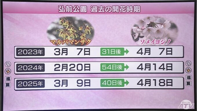 弘前市公園緑地課は、弘前公園北の郭のサクラの標準木近くのマルバマンサクの開花を目安に独自にサクラの開花予想を発表しています。
