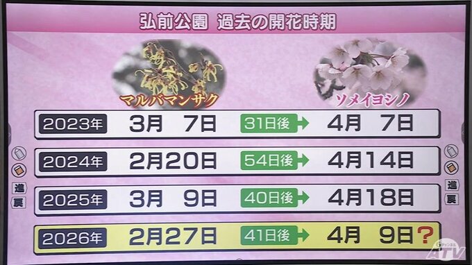 青森県弘前市の「弘前公園」にある、ソメイヨシノの開花予想の目安となっている「マルバマンサク」が開花しました。2026年は統計開始以降、過去2番目の早咲きとなりました。