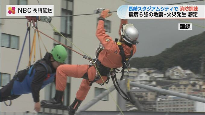 スタジアムシティの人気アクティビティ「ジップライン」が、地震の影響で途中で停止したことを想定した訓練も行われました。