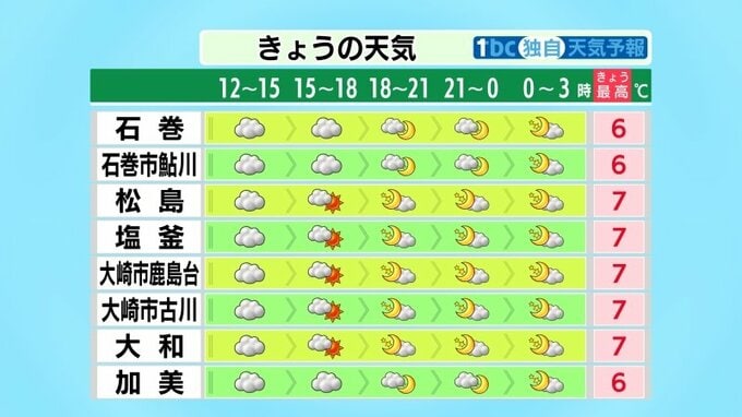 ■石巻:6℃ ■石巻市鮎川:6℃ ■松島:7℃