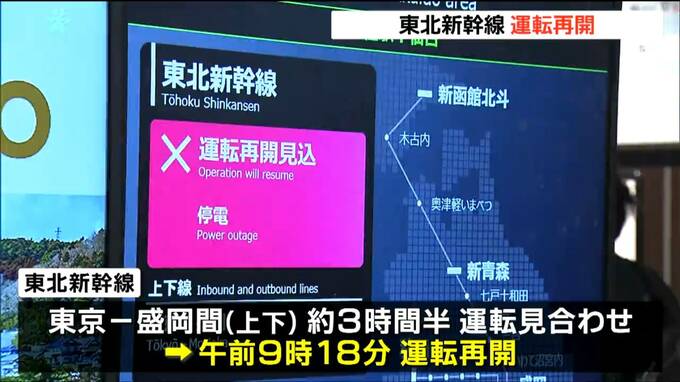 東北新幹線は4日朝、停電のため東京駅と盛岡駅の間の上下で約3時間半にわたり運転を見合わせました。運転は再開されましたが、JR仙台駅でも大勢の人が足止めを余儀なくされました。
