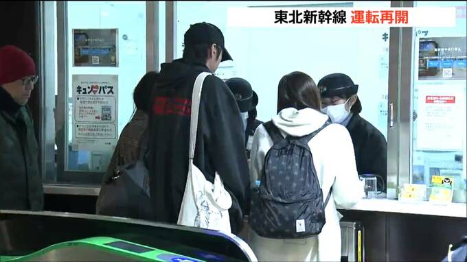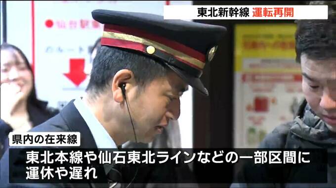 運転は、午前9時18分に再開されましたが、JR仙台駅では足止めを余儀なくされた人たちが電光掲示板を確認したり、駅員に運行状況を尋ねたりする姿が見られました。