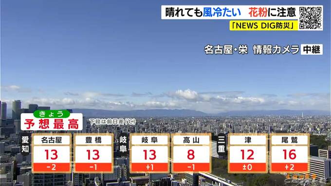 最高気温は名古屋や豊橋、岐阜で13℃、尾鷲では16℃の予想です。