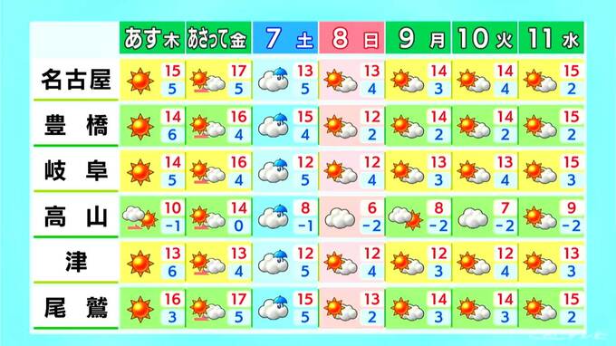 日曜日以降は日差しが戻りますが、朝晩は寒くなるでしょう。寒暖差で体調を崩さないようお気をつけください。