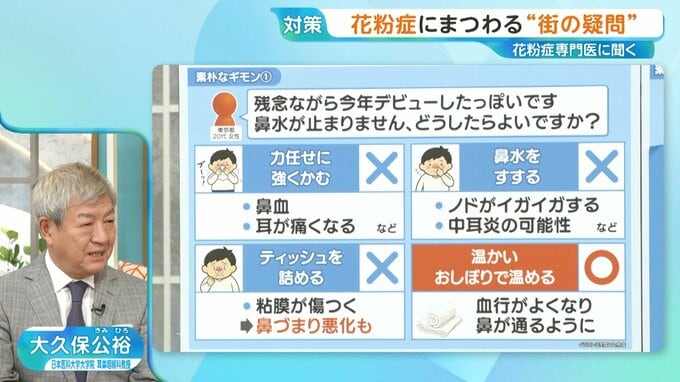 大久保医師によると、温かいおしぼりで温めることで、血行が良くなって鼻が通るようになります。