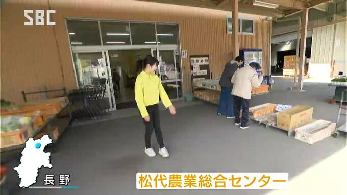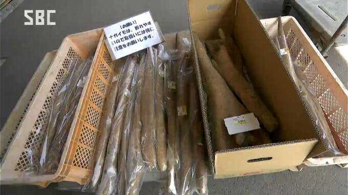 山崎キャスターリポート:「長野市松代の農産物直売所です。入り口に並ぶのは、長イモです」