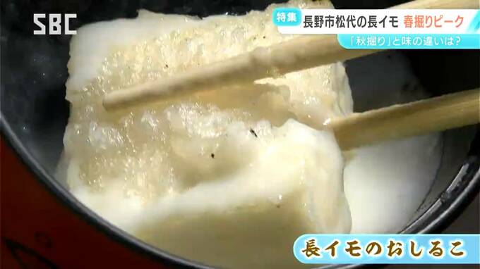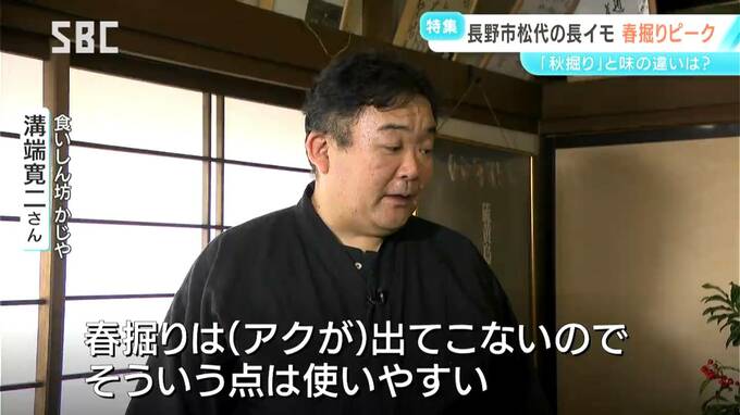 食いしん坊かじや 溝端寛二さん:「色が変わらないというのは、一番助かるところですね。秋の長イモはどうしてもアクが出やすいので、とろろが少し黒っぽくなるが、春掘りには出てこないので、そういう点は使いやすい」