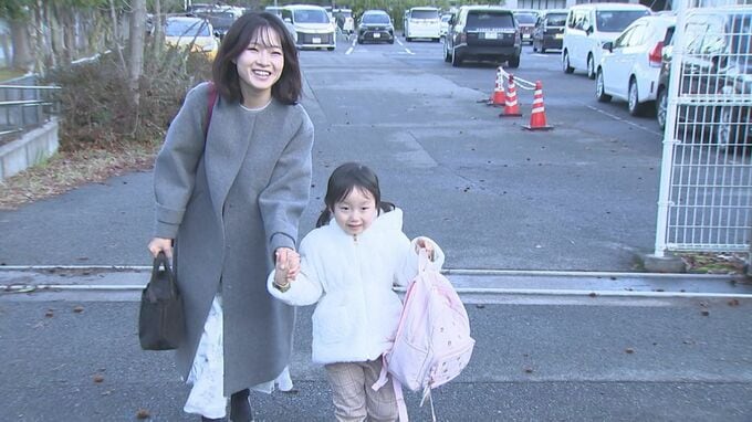 鳥大病院の敷地内にある保育所に登園したのは、坂口真弓さんと千絵ちゃんの親子。