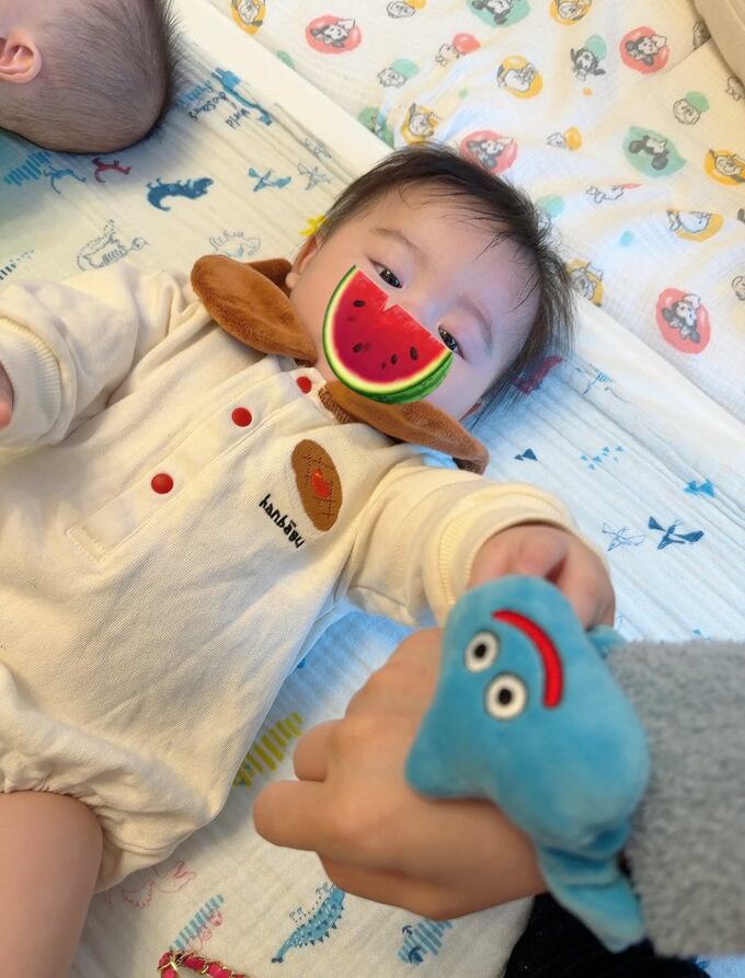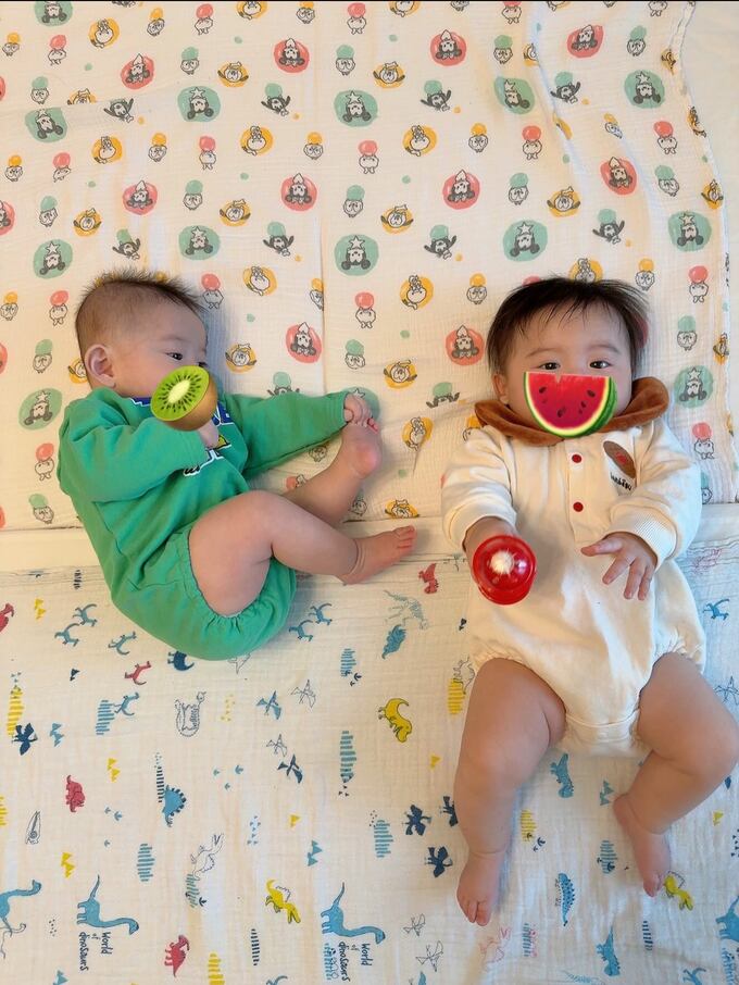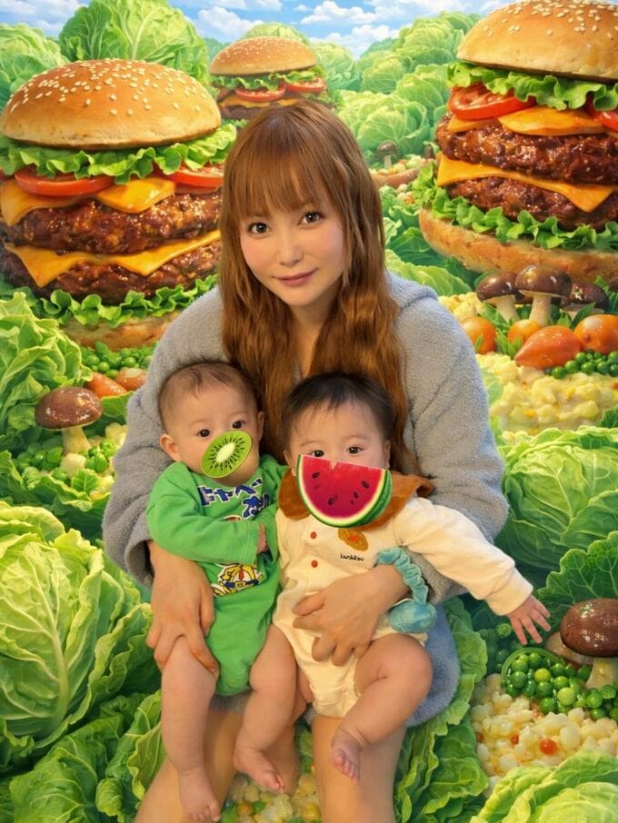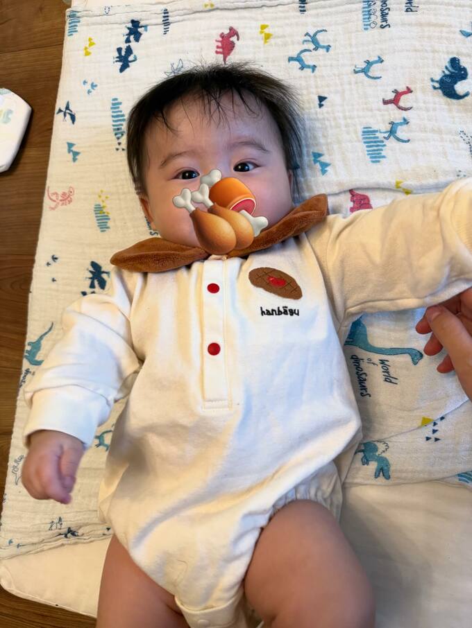 この記念すべき日に中川さんが選んだ衣装も、彼女らしい遊び心に溢れていました。双子の兄弟が着用していたのは、スナック菓子「キャベツ太郎」と、美味しそうな「ハンバーグ」が大きく描かれたユニークなロンパース。