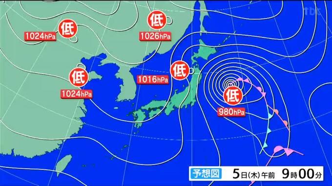 5日午前9時の予想天気図です。低気圧が急速に発達し、日本の東に中心を移すでしょう。東北地方と北海道の太平洋側では、等圧線の間隔が狭くなる見込みです。