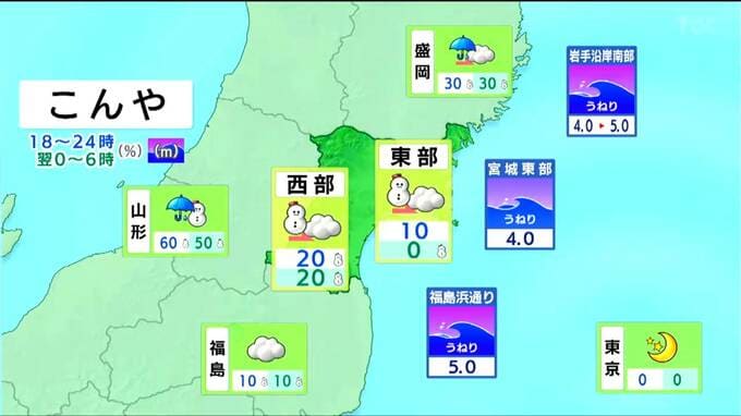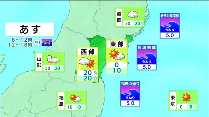 晴れや曇りの所が多いですが、北部の山沿いを中心に雪や雨が降るでしょう。東部では、北西の風が強く吹き、海上の波はうねりを伴い5mまで高くなる見込みです。警報級の強い風や高波となるおそれもあるため、強風と高波に注意・警戒してください。