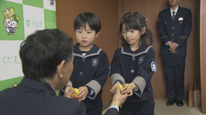 山口県民共済生活協同組合の三浦靖彦理事長からこの春、下松市内の小学校に入学する園児の代表2人に防犯ブザーが贈られました。
