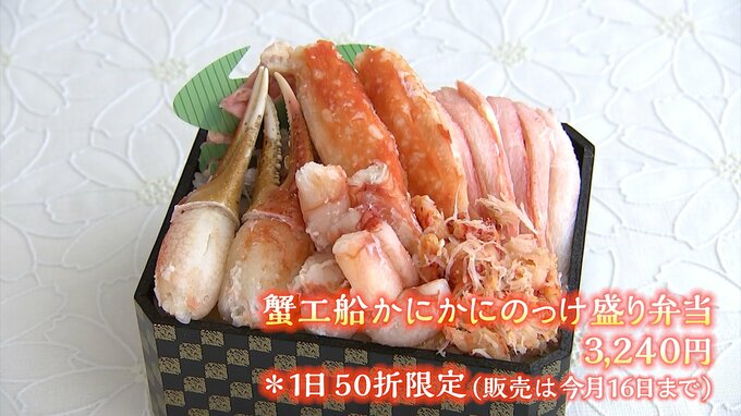 列に並んでいる人の目当ては、カニがてんこ盛りの弁当。一折に5種類のカニが乗っていて中には北海道でしか取れない幻のカニと呼ばれる花咲(はなさき)ガニも入っています。