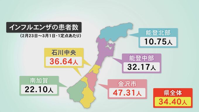 定点調査による1医療機関あたりの患者は、石川県全体で34.40人となり、警報基準の30人を2週連続で上回りました。