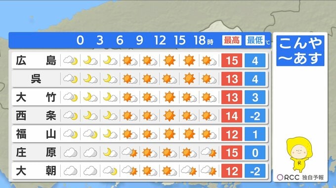 こんやからあす朝にかけてかなり冷えますのであたたかくしてお休みください。北部や内陸部では氷点下の冷え込みになる見込みです。日中はきょうと同じくらいから2℃~3℃ほど高くなる地点が多いでしょう。風が穏やかできょうよりも過ごしやすくなりそうです。