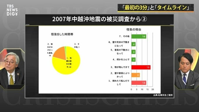松尾さんが2007年の中越沖地震後に柏崎市の仮設住宅で行った調査では、50人の被災者のうち7割近くが揺れている最中に怪我をしており、約3割が揺れが収まった後に負傷していました。