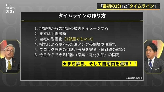 タイムライン防災の第一人者として知られる松尾さんが特に重視するのが、地震発生直後の行動です。