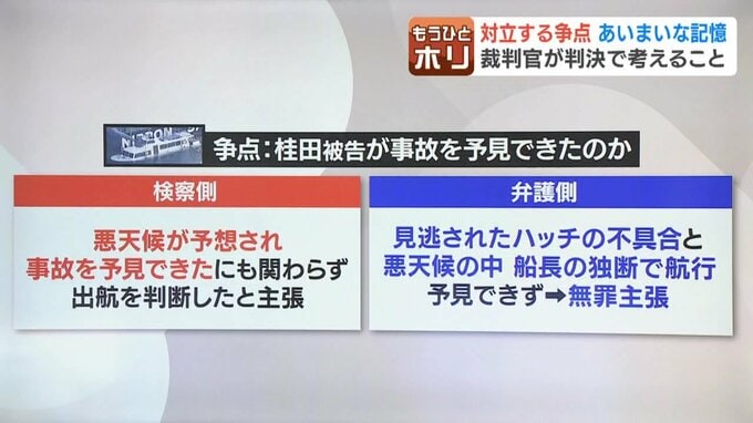 一方、弁護側は、国の検査でも見逃された 船の出入り口=ハッチの不具合が原因の事故だったうえに、船長の独断で航行を続けたことで予見はできなかったとして、無罪を訴えています。