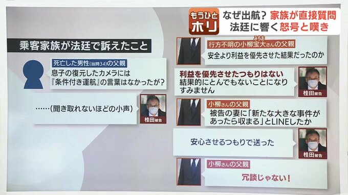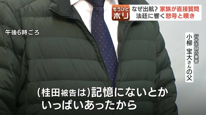 行方不明となっている息子 小柳宝大さんの父親は「この事件は、安全より利益を優先させた結果だったとは思わないのか」と問い質したのに対し、桂田被告は「利益を優先させたつもりはない。結果的にとんでもないことになり、すみません」と答えました。