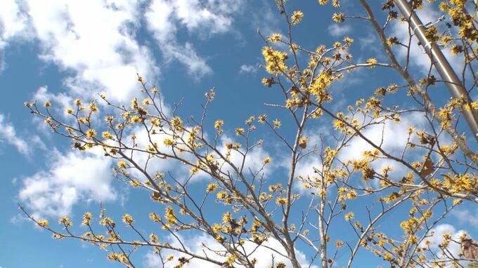 飯田市の千登勢マレットゴルフ場では、2月初めにマンサクの花が咲きはじめ、見ごろを迎えています。