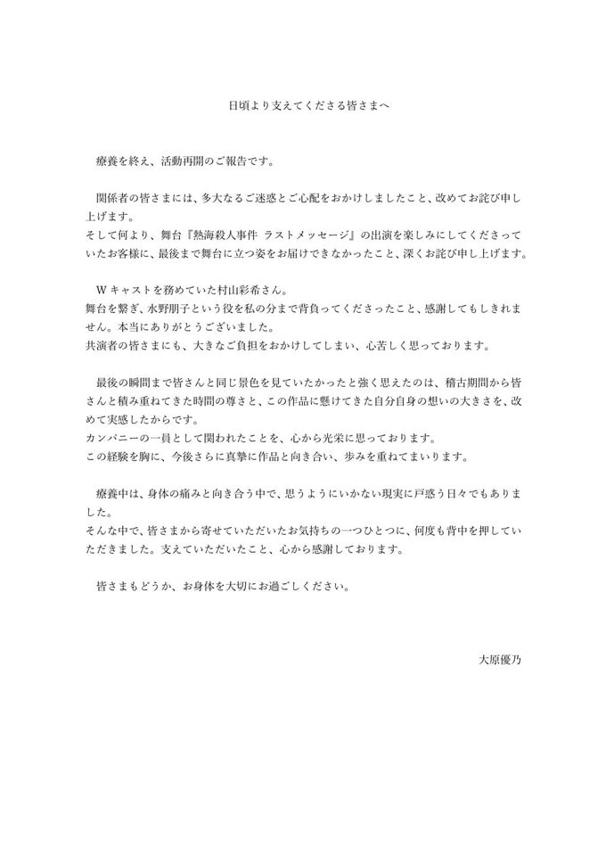 大原さんは「このたび、無事に療養期間を終え、活動を再開いたしました」と報告し、関係者に陳謝。「舞台『熱海殺人事件 ラストメッセージ』の出演を楽しみにしてくださっていたお客様に、最後まで舞台に立つ姿をお届けできなかったこと、深くお詫び申し上げます」と、ファンに向けても陳謝の思いを伝えています。