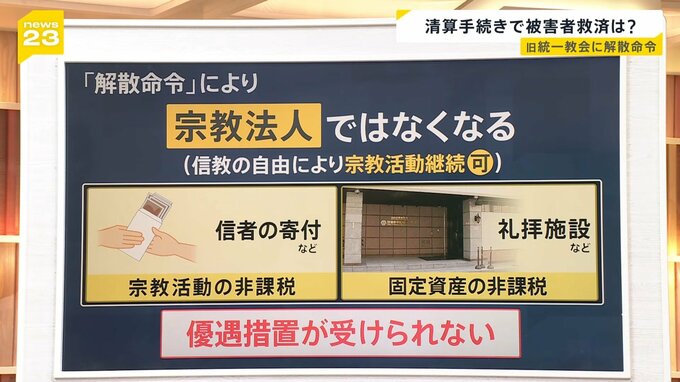 解散命令によって、旧統一教会は「宗教法人」ではなくなります。一方で、憲法によって信仰の自由は保障されているので、宗教活動は継続することができます。