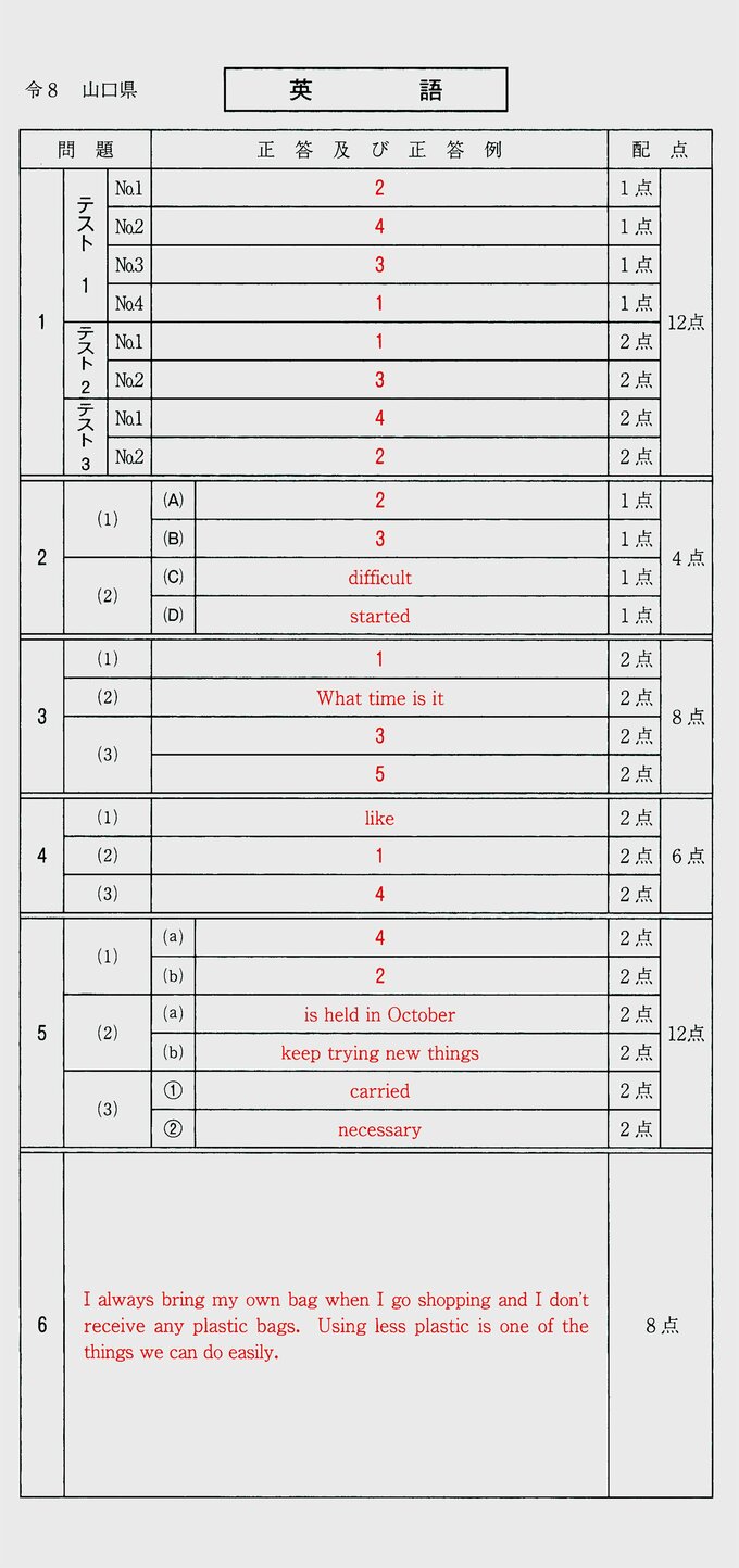 山口県公立高校入試『英語』試験問題・解答(令和8年度・2026年度) テレビ山口 2026年3月5日(木) 16:30 国内 解答 ●各科目の試験問題・解答は、次のリンクから見ることができます。 【国語】【数学】【英語】【社会】【理科】