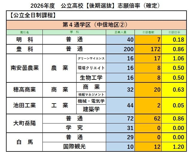 【最終志願倍率】長野県公立高校入試2026 後期選抜【全校一覧掲載】全日制の最終志願者数は7795人 志願倍率は0.89倍 信越放送 2026年3月5日(木) 17:00 国内 第4通学区(中信地区②)