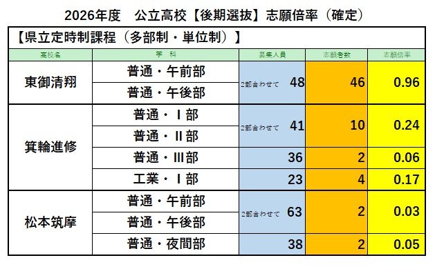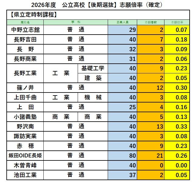 【最終志願倍率】長野県公立高校入試2026 後期選抜【全校一覧掲載】全日制の最終志願者数は7795人 志願倍率は0.89倍 信越放送 2026年3月5日(木) 17:00 国内 県立定時制課程 多部制・単位制