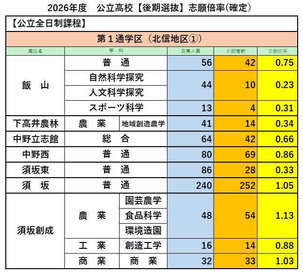 【最終志願倍率】長野県公立高校入試2026 後期選抜【全校一覧掲載】全日制の最終志願者数は7795人 志願倍率は0.89倍 信越放送 2026年3月5日(木) 17:00 国内 第1通学区(北信地区①)