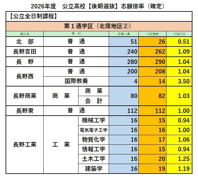 【最終志願倍率】長野県公立高校入試2026 後期選抜【全校一覧掲載】全日制の最終志願者数は7795人 志願倍率は0.89倍 信越放送 2026年3月5日(木) 17:00 国内 第1通学区(北信地区②)