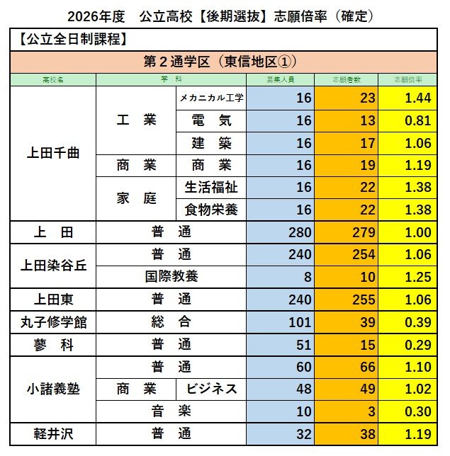 【最終志願倍率】長野県公立高校入試2026 後期選抜【全校一覧掲載】全日制の最終志願者数は7795人 志願倍率は0.89倍 信越放送 2026年3月5日(木) 17:00 国内 第2通学区(東信地区①)