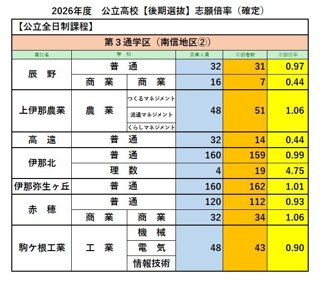 【最終志願倍率】長野県公立高校入試2026 後期選抜【全校一覧掲載】全日制の最終志願者数は7795人 志願倍率は0.89倍 信越放送 2026年3月5日(木) 17:00 国内 第3通学区(南信地区②)