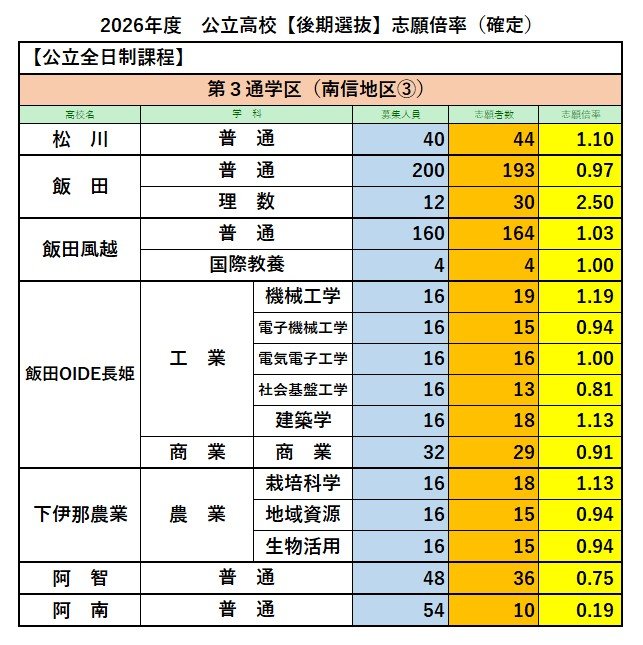 【最終志願倍率】長野県公立高校入試2026 後期選抜【全校一覧掲載】全日制の最終志願者数は7795人 志願倍率は0.89倍 信越放送 2026年3月5日(木) 17:00 国内 第3通学区(南信地区③)