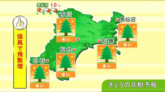 5日は風が強まりますので、花粉も各地とも多い予想です。杉林の近くなどでは非常に多く飛ぶところも出てきそうです。花粉症の方は対策をしっかりとってお出かけください。