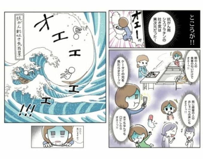 「抗がん剤(シスプラチン)の副作用です。私、お酒が大好きだったので『二日酔いの吐き気には強いぞ』なんて思っていたんです。でも、全然違いました。異次元の吐き気なんです。ご飯の匂いだけで吐く、隣の人が話しているだけで吐く。5時間も『ウエッ』とやり続けると、腹筋も背筋も壊れて、座っていられなくなるんです。トイレの床に顔をべったりつけたまま吐き続ける私は、先生にこう聞きました。『先生、嘔吐で死ぬ人っていますか?』って。それくらいキツかったんです」