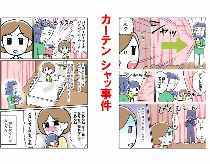 「当時、息子はまだ1歳。急にお母さんがいなくなってしまった息子のことが心配で、入院中はずっとそのことばかり考えていました。夕方、パパが息子をお見舞いに連れてきてくれる。その時間だけが唯一の楽しみだったんですが、ある日、息子が病室のカーテンを自分でシャッと閉めてしまったんです。パパが開けても、また閉める。息子は泣きながら『バイバイ、い~や~よ、バイバイ、い~や~よ』って言っていました。1歳なのに、『会えばまた別れが来る』ということを理解させてしまっていたんです。もう少し大きくなると、随分聞き分けが良くなって面会もできて、エレベーターまで見送るまでニコニコの息子。でも、ドアが閉まった瞬間に『ギャー!』という泣き声が、エレベーターが降りる速度に合わせて遠ざかっていく。あの泣き声は一生忘れられません。廊下にへたり込んで『ママが病気でごめんね、ごめんね』と叫ぶしかありませんでした」