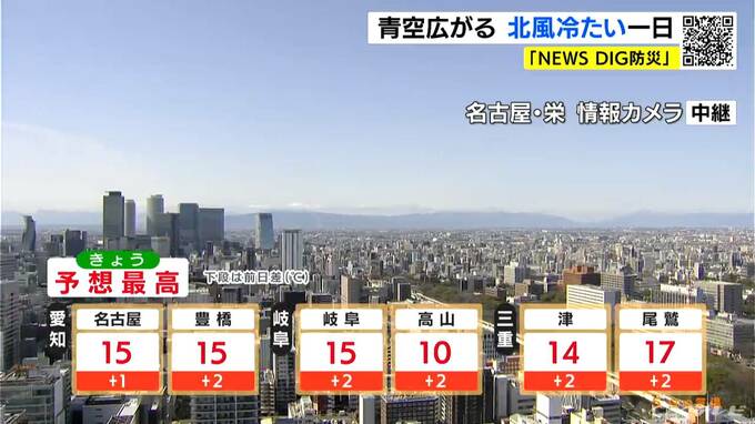 正午前の名古屋市内は、雲はなく、すっきりとした青空が広がっています。気温は12.7℃で、朝から風が強まっています。