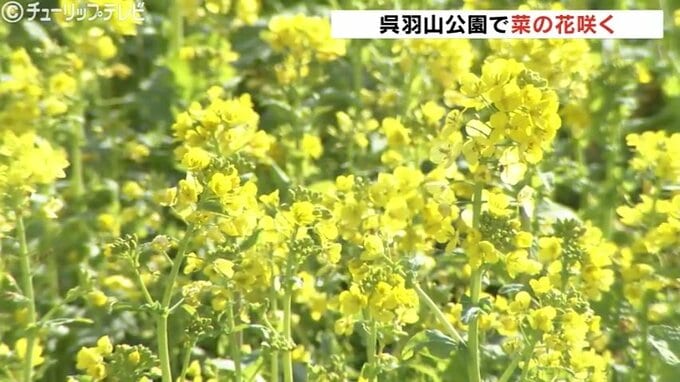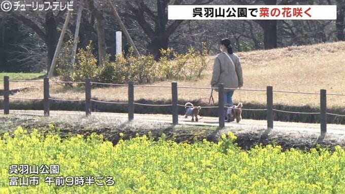 富山市の呉羽山公園では鮮やかな菜の花が黄色のじゅうたんのように広がり一足早い春の装いをみせています。