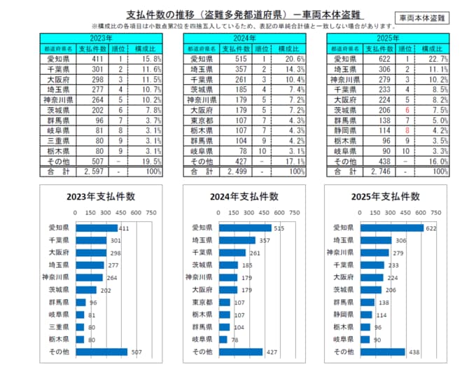 特に愛知県では被害が深刻化しており、車両本体盗難の支払件数でワースト 1 位となりました。