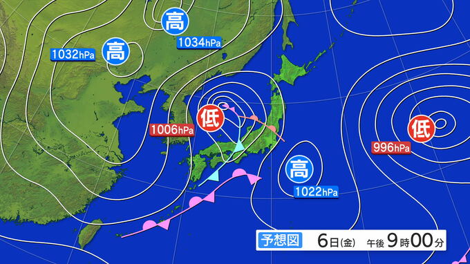 6日(金)午後9時の予想天気図です。日本海を低気圧が発達しながら進む見込みです。