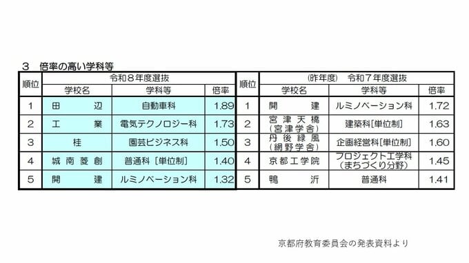学校別の倍率 田辺(自動車)がトップ 前年度トップの開建は?
