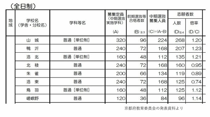 【各校の倍率を見る】山城、鴨沂、洛北、北稜、朱雀、洛東、鳥羽、嵯峨野