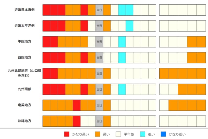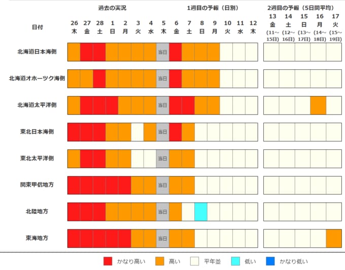 東北地方、東・西日本、沖縄・奄美の気温は、向こう1週間程度は平年並か低い日が多いですが、その後は平年並か高いでしょう。