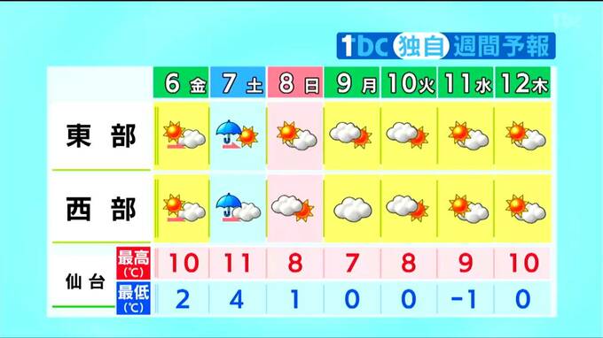 最低気温は、5日朝より3度前後低く、平年並みかやや高いでしょう。最高気温は、5日とあまり変わらず、3月中旬から下旬並みの見込みです。