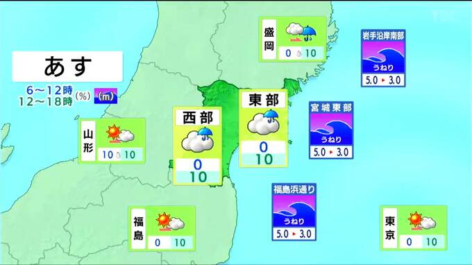 午前中は晴れますが、午後は次第に曇るでしょう。夜遅くからは、雨が降り出しそうです。海上の波は5メートルのち3メートルと高く、うねりを伴うでしょう。