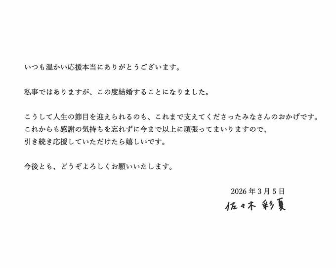 佐々木彩夏さんは「いつも温かい応援本当にありがとうございます。私事ではありますが、この度結婚することになりました。」と、報告。